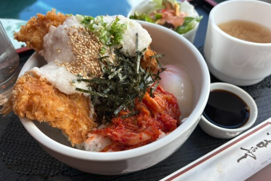- 特徴: 普通のカツ丼とは違い、とんかつの上に「とろろ・卵・キムチ」がのった衝撃のビジュアル。出汁の効いた優しい味わいがクセになります。
