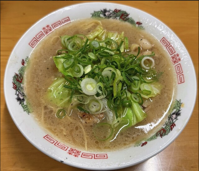 お店の一番人気。牛骨ベースの濃厚な醤油スープに、プリプリの巨大ホルモンがこれでもかと入っています。 キャベツやもやし、玉ねぎといった野菜炒めもたっぷりで、食べ応えは抜群です。