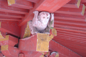 そこには建物を支えるように彫られた「棟持猿(むねもちざる)」がいます。
