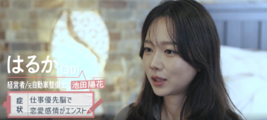はるか(池田陽花) 30歳。整備士支援会社経営。元自動車整備士という異色の経歴。サバサバした性格と恋愛で見せるギャップに期待です。