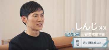 しんじ(石丸伸二) 43歳。元安芸高田市長。論理的でストレートな発言が印象的。恋愛番組でどのように女性と向き合うのかに注目が集まります。